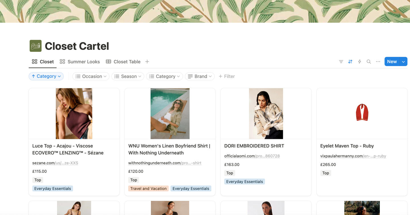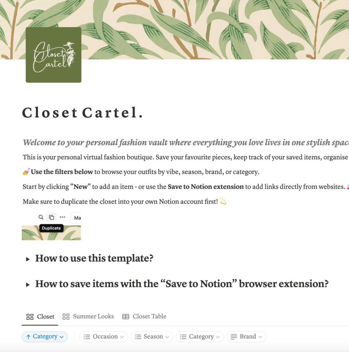 Closet Cartel is a Notion template that transforms your saved fashion finds into your own personal boutique.No more chaotic screenshots, endless browser tabs, or forgotten links.I made this because I was drowning in tabs and screenshots. Every time I saw something I liked online, I'd save it somewhere, favourites lists, random notes, screenshots, open tabs I’d never close… it got overwhelming. I kept impulse buying stuff I didn’t need, and I had no real plan for my wardrobe.So I built this to help me stay organized. Now I have one place where I can save all my favourite pieces from different stores, sort them into categories like dresses, shoes, or basics, wedding guest, and actually see my wishlist come together like a personal curated storefront. It’s helped me be more intentional with what I buy and feel like I finally have a plan.Sharing it in case it helps someone else too!Organise your dream wardrobe by category, season, occasion, or vibe - then scroll through it like your very own online store.